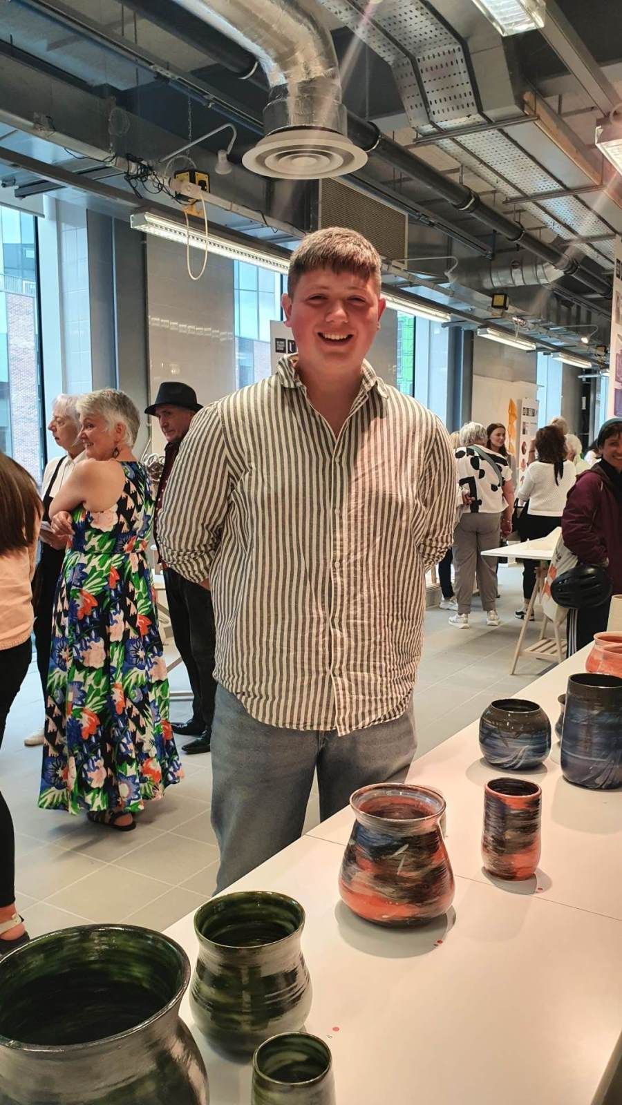 Luke Steele photographed on the Degree show University of Ulster, 7th June. Luke studied BA Hons Fine Art, Sculpture Lens Ceramics. His ceramic pots were sold out on Friday evening. In the Artist’s statement he wrote, ‘ I view creation as a beautiful story of God’s power and authority over everything. Using clay allowed me to take part of God’s creation and shape it into a piece of art which honours and represents his rule. I feel that this was a really rewarding project that gave me purpose and reason for my art’